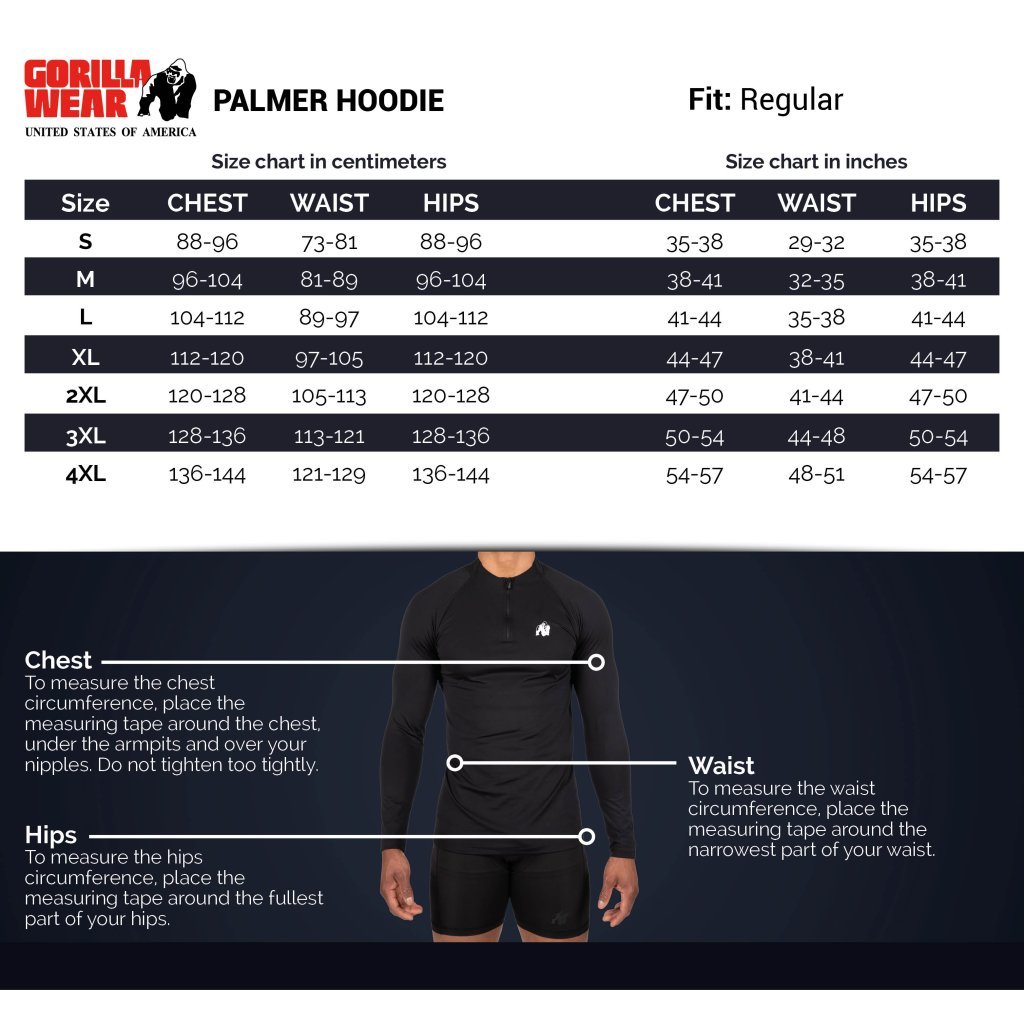 Mikina Palmer je vhodná v různých situacích, ať už jste v posilovně, cvičíte venku nebo si užíváte dny volna. Je vyrobena ze směsi bavlny a spandexu, díky čemuž je mikina příjemná a pružná. To zajišťuje optimální rozsah pohybu. Mikina má kapuci se stahovací šňůrkou, elastické patenty a sítotiskové logo Gorilla Wear na hrudi. Dostupné v černé a šedé barvě.